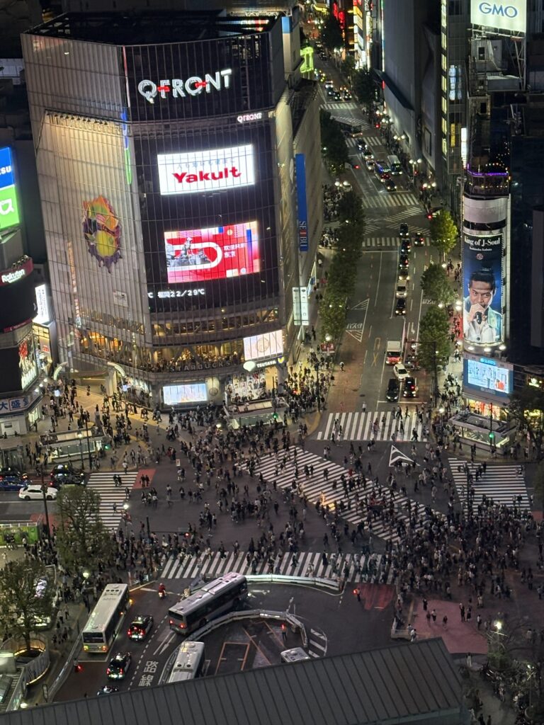 For cocktails that evening, I led us to C’est La Vie — which, despite its name, was not rooftop chic but a slightly dingy neighborhood dive. An hour and 14,000 yen later, we finally course-corrected to Ce La Vi on the 18th floor — cocktails in hand, orchestra-row seats for the human symphony of Shibuya Crossing.