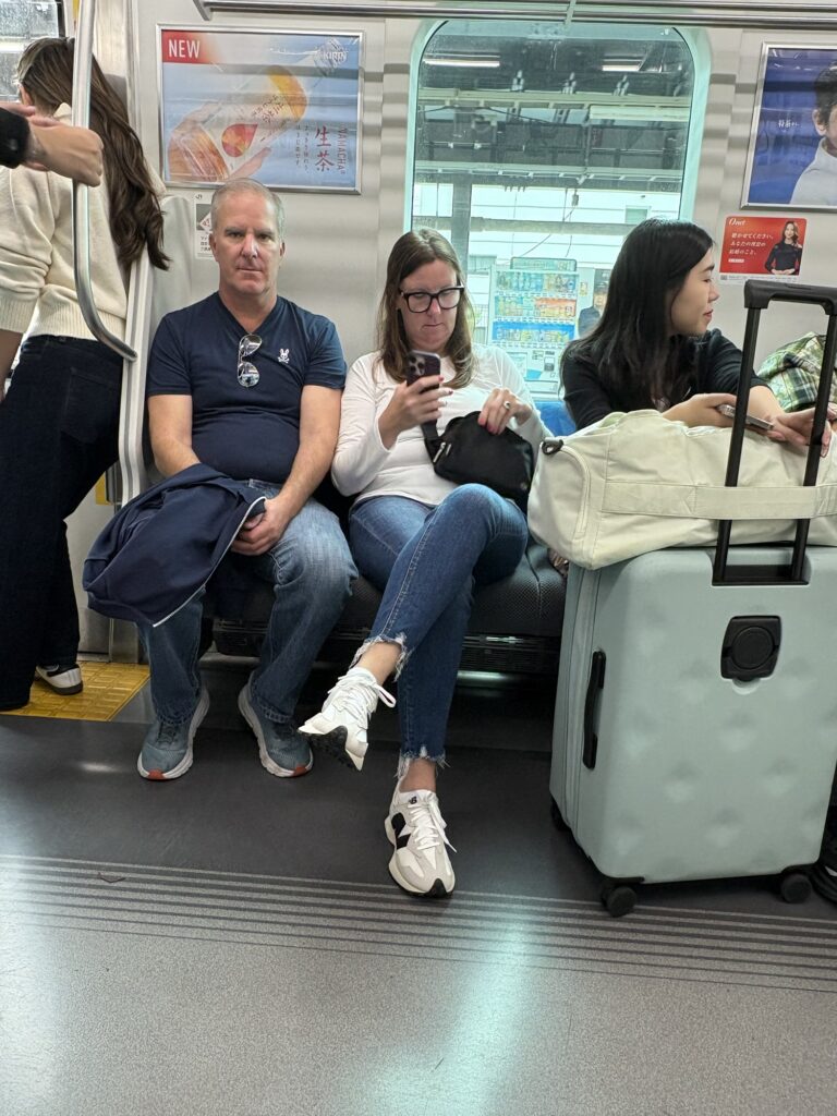 We arrived in Tokyo on Sunday morning, hitting the streets by 10 a.m.armed with nothing but Japanese Rail (JR) Line schedules, misplaced confidence, and the stamina of our own two feet. Shinagawa Station pulsed with families and travelers who pirouetted through the platforms as if born with transit choreography. Meanwhile, Mark, Deb, and I shuffled like three great disruptors, throwing sand into the gears of a city that has zero patience for amateurs.